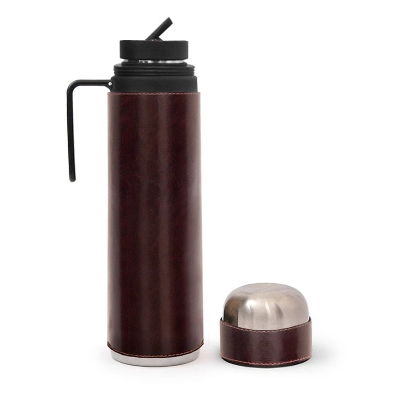 Termo de Acero Inoxidable forrado en símil cuero. Con asa rígida y pico cebador.