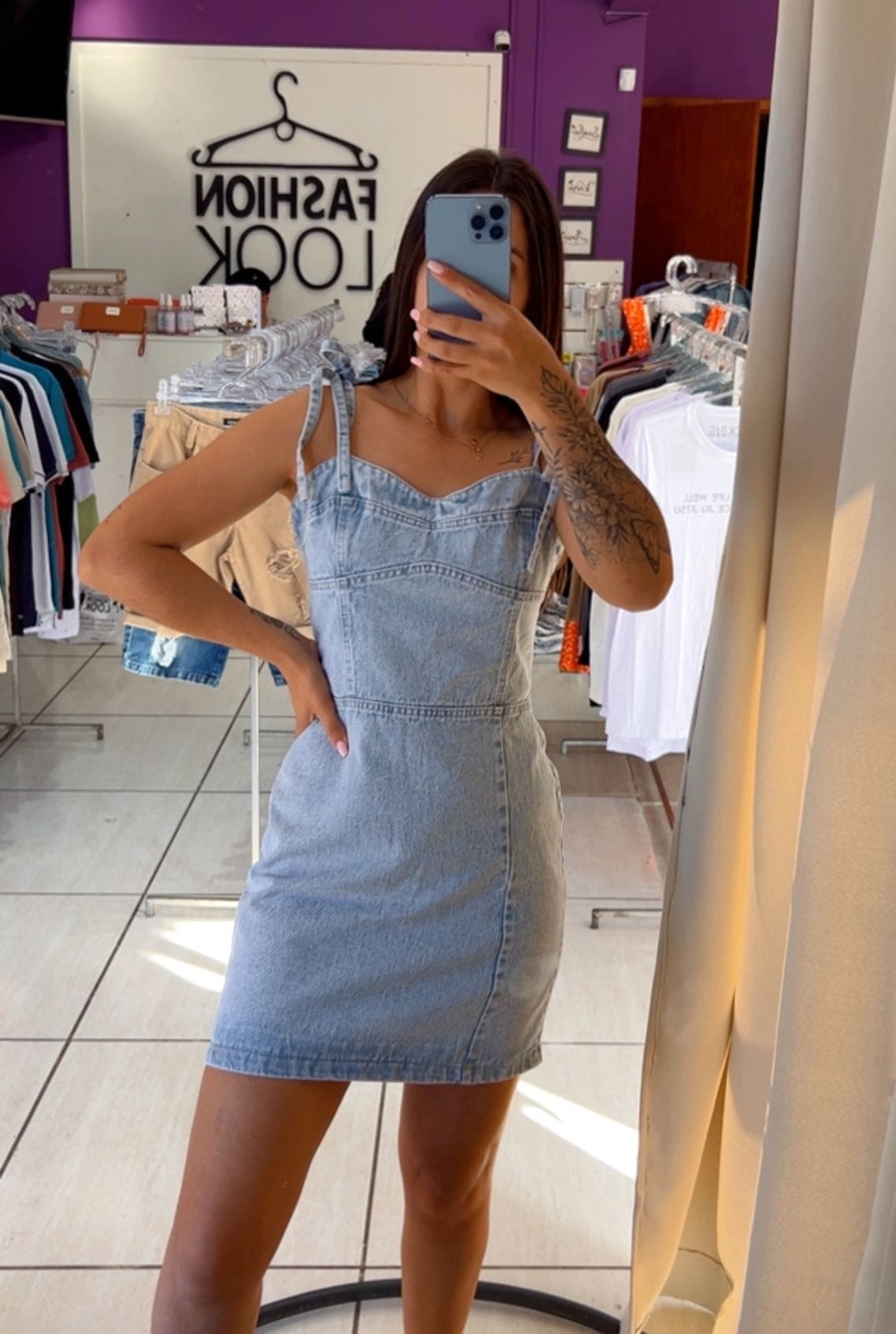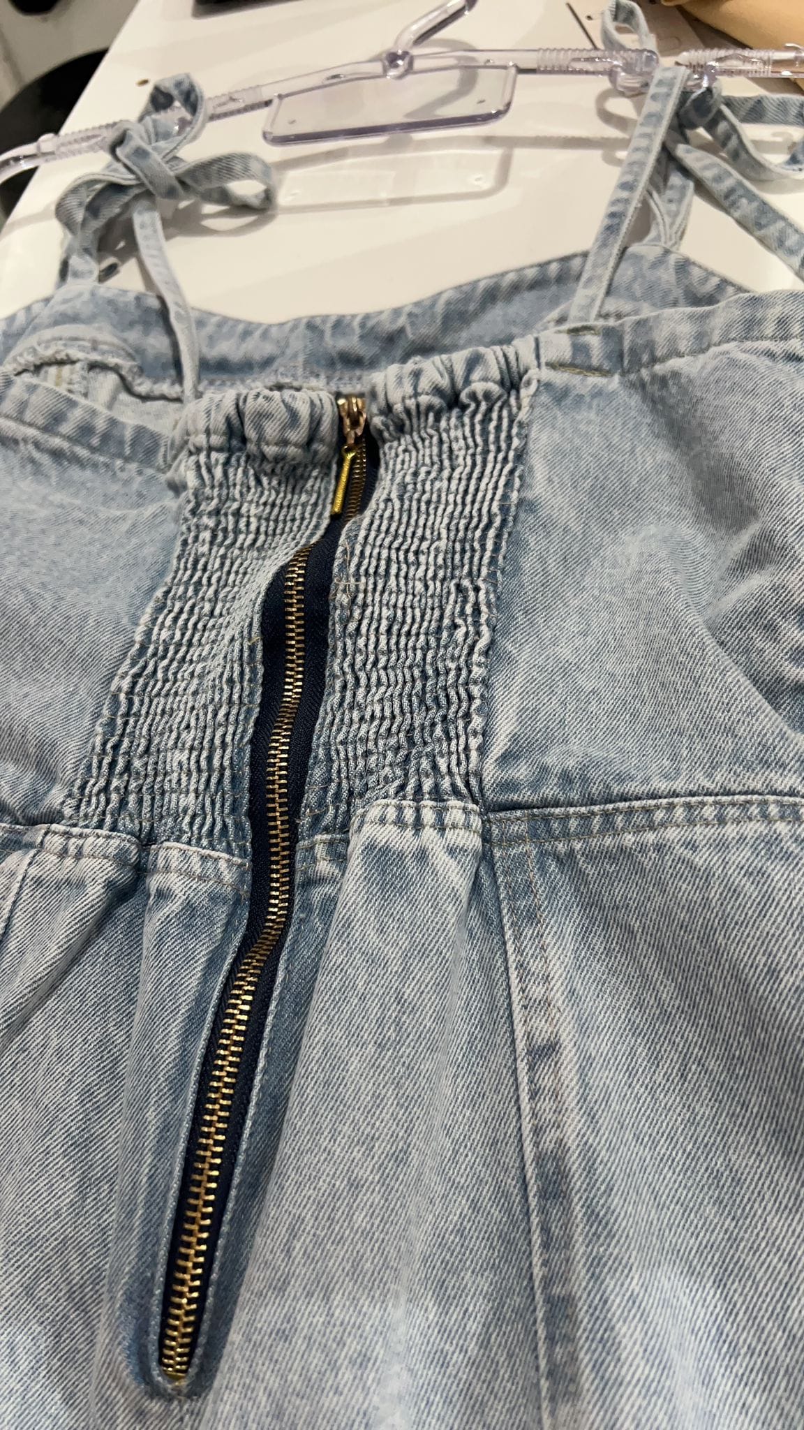 Vestido de jeans sin lycra, tira con elástico atrás y cierre.
